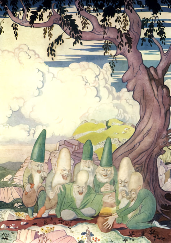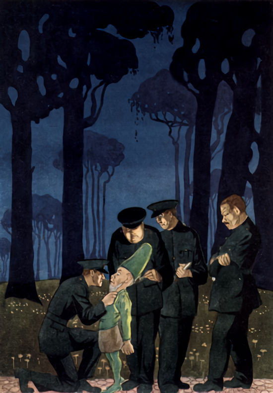 Thus, speaking more to herself than to the children, the Thin Woman beguiled the way. The moon had brightened as she spoke, and on either side of the path, wherever there was a tree or a rise in the ground, a black shadow was crouching tensely watchful, seeming as if it might spring into terrible life at a bound. Of these shadows the children became so fearful that the Thin Woman forsook the path and adventured on the open hillside, so that in a short time the road was left behind and around them stretched the quiet slopes in the full shining of the moon.