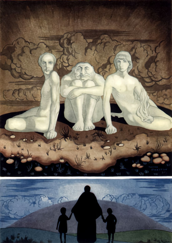 They were quite naked, and each of them gazed on her with intent earnestness. The first was so beautiful that the eye failed upon him, flinching aside as from a great brightness. He was of mighty stature, and yet so nobly proportioned, so exquisitely slender and graceful, that no idea of gravity or bulk went with his height. His face was kingly and youthful and of a terrifying serenity. The second man was of equal height, but broad to wonderment. So broad was he that his great height seemed diminished. The tense arm on which he leaned was knotted and ridged with muscle, and his hand gripped deeply into the ground. His face seemed as though it had been hammered from hard rock, a massive, blunt face as rigid as his arm. The third man can scarcely be described. He was neither short nor tall. He was muscled as heavily as the second man. As he sat he looked like a colossal toad squatting with his arms about his knees, and upon these his chin rested. He had no shape nor swiftness, and his head was flattened down and was scarcely wider than his neck. He had a protruding dog-like mouth that twitched occasionally, and from his little eyes there glinted a horrible intelligence. Before this man the soul of the Thin Woman grovelled. She felt herself crawling to him. The last terrible abasement of which humanity is capable came upon her: a fascination which would have drawn her to him in screaming adoration. Hardly could she look away from him, but her arms were about the children, and love, mightiest of the powers, stirred fiercely in her heart.