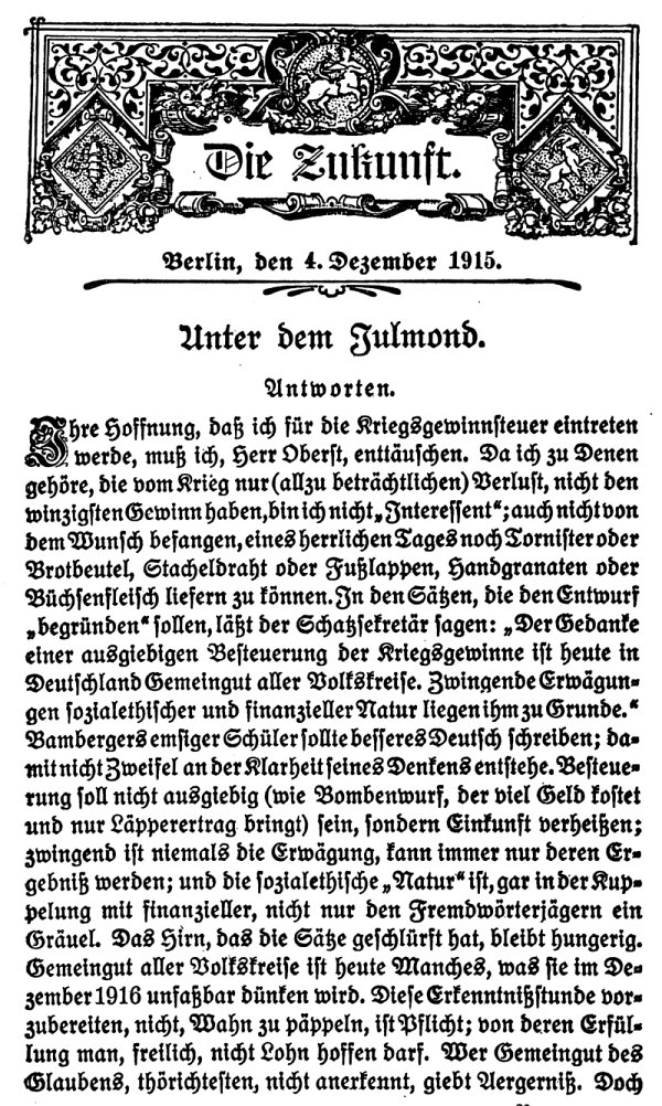 EXACT SIZE REPRODUCTION OF A PAGE OF THE FAMOUS "DIE ZUKUNFT" PUBLISHED BY MAXIMILIAN HARDEN, THE ONE UNCENSORED EDITOR OF GERMANY