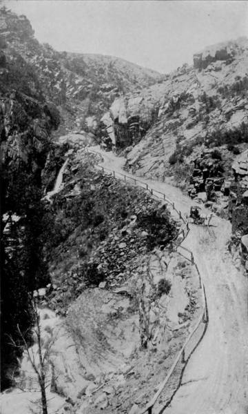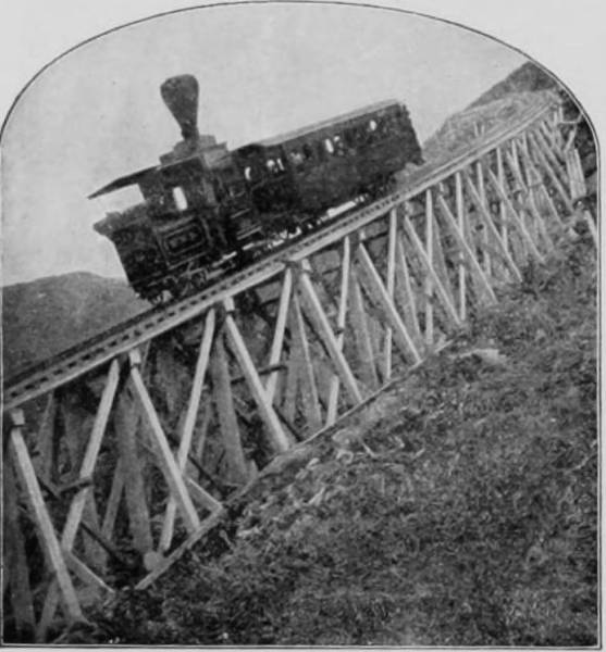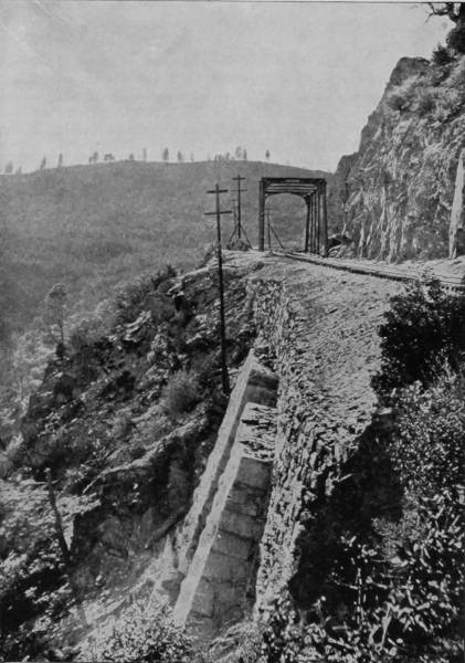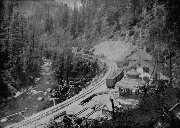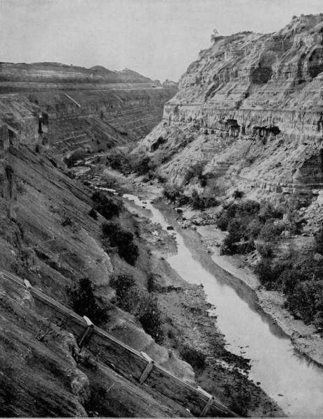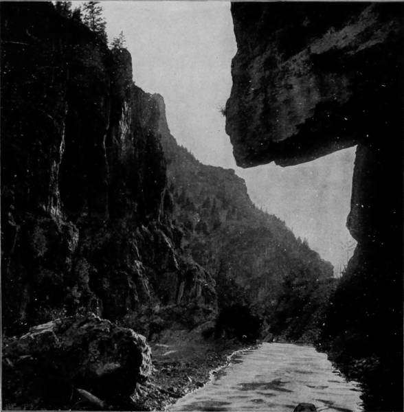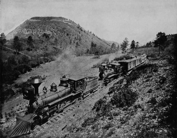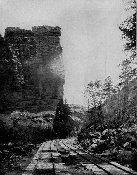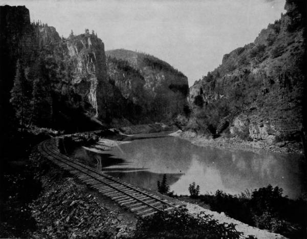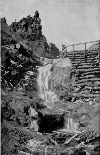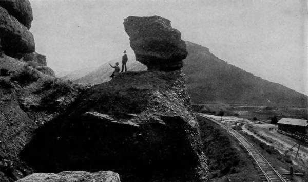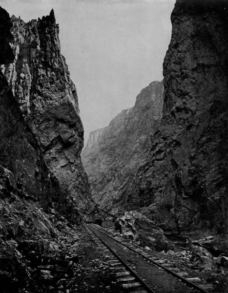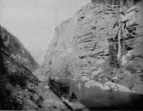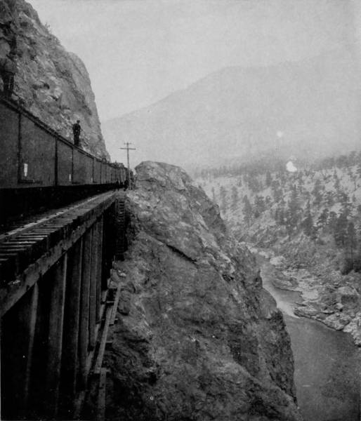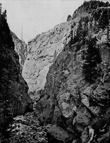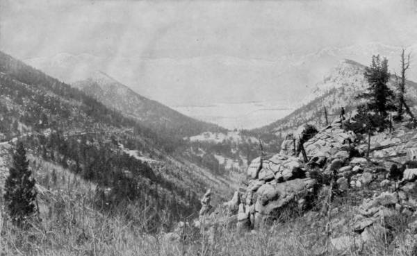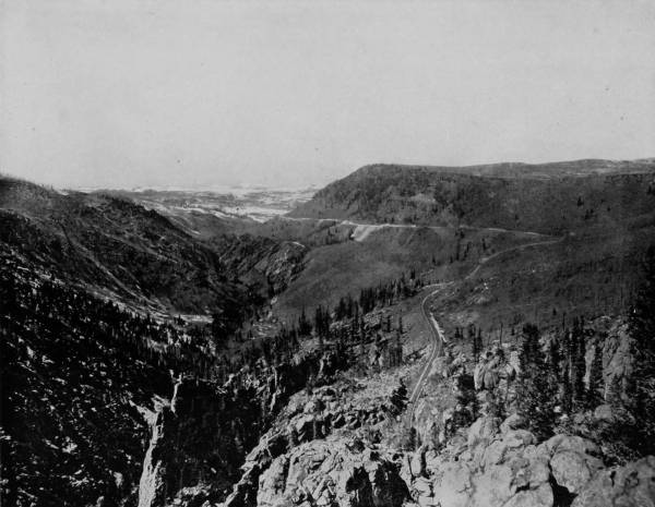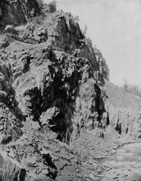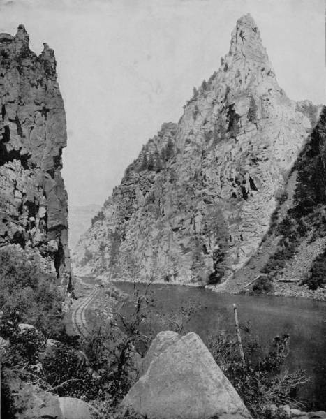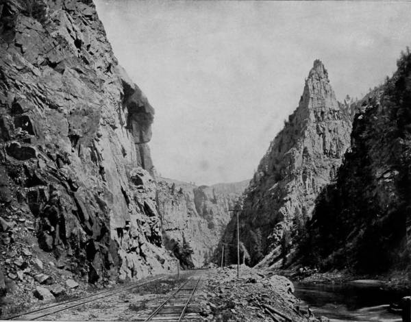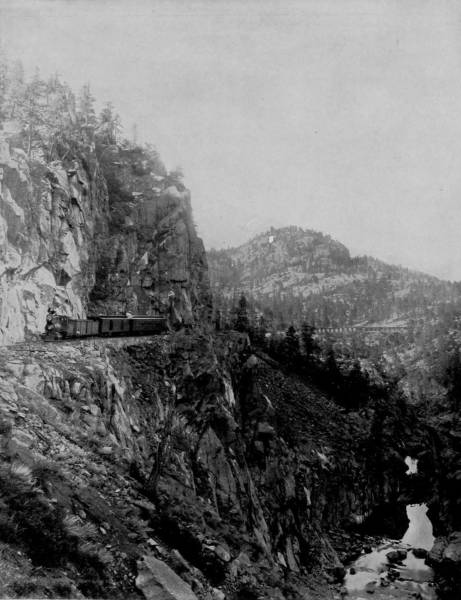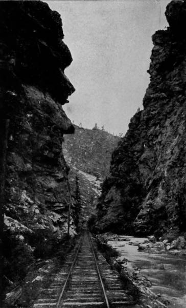 Only a few miles from Golden is Clear Creek Cañon, another wondrous cleavage wrought by water that goes tumbling through the passage with rumble of breakers and roar of waterfall. The walls of the cañon rise perpendicularly to varying heights of 500 to 1,500 feet, and at places approach so near to each other that an observer looking upward from the cavernous depths can see only a thin strip of blue sky. Away up on the brows of the parallel cliffs are large trees that look like feather dusters, and little streams of liquid silver appear in the distance to be pouring their contributions from crevice and apex to swell the mad creek that rushes with complaining voice down the age-swept gorge. Along this water-bed was formerly the roadway, or trail, used by freight-wagons and stage-coaches, but it is now become the exclusive thoroughfare of the Central Branch, so that the magnificent view which the cañon affords is before the eyes of railroad travelers.