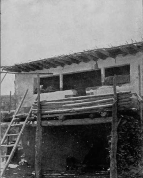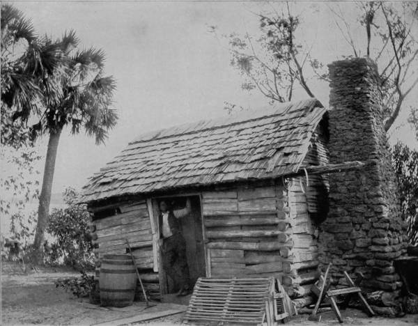 Inseparable, almost, from the log-house of the Southern poor, is the cabin home of the negro, because the two are separated by such a thin line of distinction that only critical inspection can prevent them from assimilating in the minds of those unfamiliar with Southern life. There is the same stone-chimney and clap-board roof, but the colored man’s cabin is a single room, and the front is porchless. More hasty construction is also noted, for the logs are laid like a turkey-pen, and clap-boards are used again, not for weather-boarding, but as a substitute for batten. Windows are not needed, through which to exchange civilities with the season, for there are holes and crannies to let smoke out, and plenty of accidental entrances for the warm summer air to get in. It is thus at small effort and no care the worst weather is kept out, and contentedness reigns within.