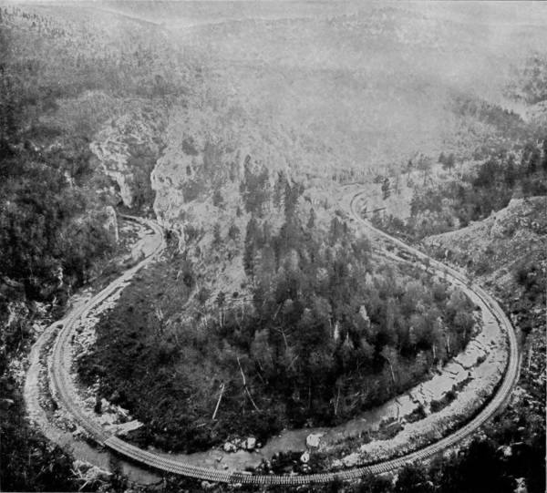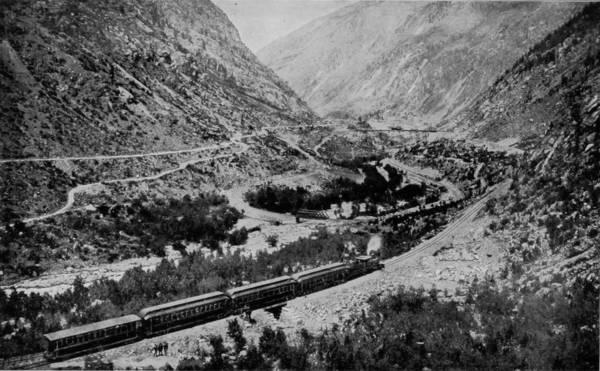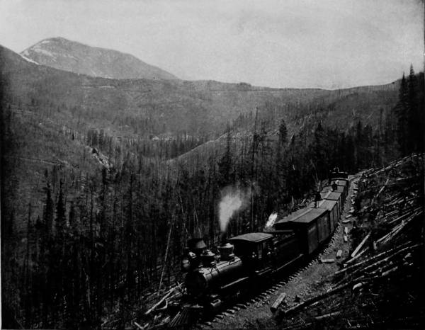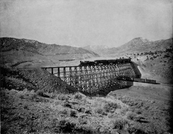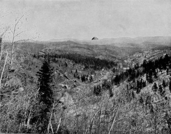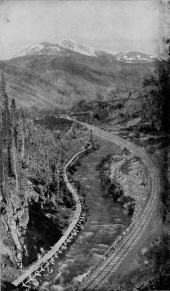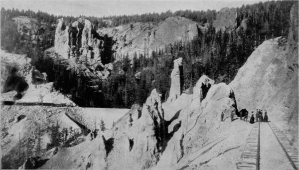 20But we have now reached the backbone of the divide and our train starts down the western grade, circling like a hawk out of the sky. Over immense fills, through deep cuts, across bridges, following a swiftly-flowing stream, until at length we gain the level valley and go dashing away to Graymont, on the way to Idaho Springs and Georgetown. To avoid tunneling in crossing the divide, the railroad winds around the mountain elevations, up a steep grade, over a way that has been blasted out of the eternal rocks, until from away up the lofty sides the traveler may look upon a scene of marvelous beauty and ruggedness that fades into indistinctness miles below. Leaning out of the car window we view a wondrous panorama, and pause directly to bring our cameras into use, that the scene may be caught and held on paper. There on one side of the depths is Devil’s Gate, in close proximity, as it seems, to Bridal Veil Falls, where the clear mountain stream plunges over a precipice of great height to join the gamboling creek that rushes away on its errand hundreds of feet below. There, too, is a spider’s web of steel, eighty-six feet high, that has served as a passage-way for our train across a chasm 300 feet wide, whose bottom can scarcely be distinguished from our lofty eminence; but we see that the track makes a complete loop, and that the road parallels itself, at a constantly increasing grade, no less than three times. All the while that we are winding around and crossing our own track, Georgetown continues visible, but it is dwarfed by the distance to the appearance of a prairie-dog village.