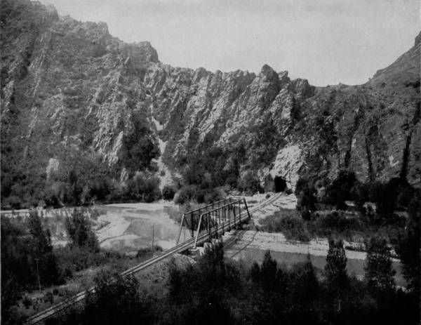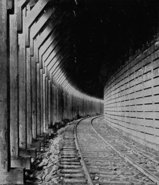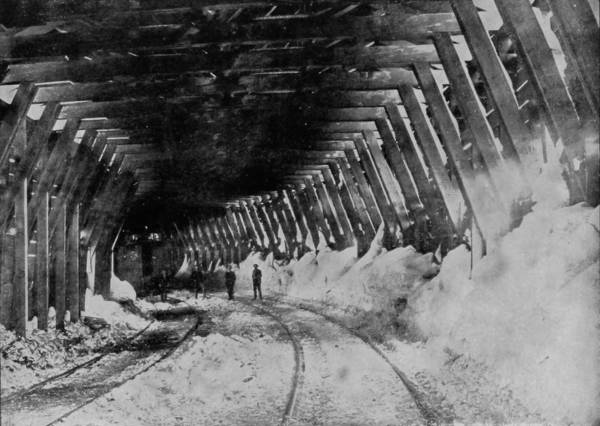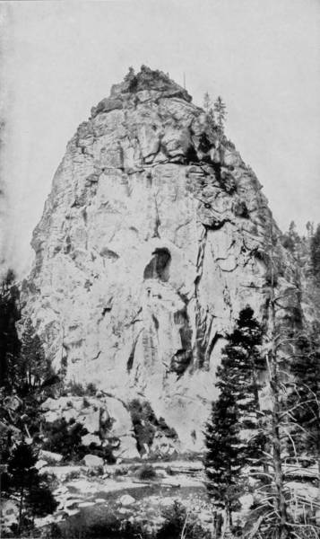 Dome Rock is one of the conspicuous curiosities in the cañon, resembling as it does, the top of a mosque that has sunk just behind the wall of beetling cliff, leaving a graceful dome as its burial monument. But all along, at frequent intervals, spires, with cathedral proportions, shoot skyward, lending an appearance not unlike a vast row of churches, where we may fancy nature worships, and the roar of waters is a perpetual hymnal invocation. On the same route, fifty miles from Platte Cañon, is the Alpine Tunnel, which is reached by the road winding about and upward until a height of 11,600 feet is gained, when, suddenly, the train makes an abrupt turn, and leaps into the very bowels of a mountain from which it emerges after many minutes on the other side, and then descends towards the Pacific. This tunnel is one of the most remarkable in all the world. It is at the highest point ever reached by any railroad in America, and in the center of its 1,773 feet of length is the dividing line of altitude between the two oceans. The boring of this mighty channel not only involved the naturally stupendous labor of digging through a mountain, but the work was rendered a hundred fold more difficult by reason of the rare atmosphere in which the workmen had to labor. In addition to this, 70,000 linear feet of California redwood was required for the inside bracing, and this had to be brought up the mountain side on the backs of burros, the only animals of burden that could make the ascent. It was a remarkable undertaking; its accomplishment was very like a miracle.