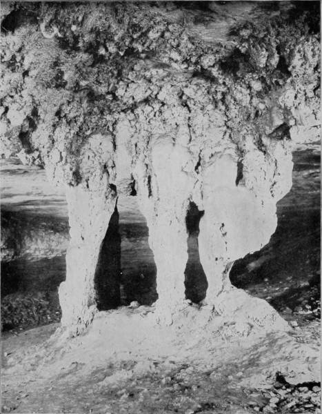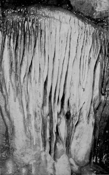 This curious feature is even more marked by the stalactites in Mary’s Vineyard, where they appear in the form of an aggregation of spherical prominences, resembling clusters of grapes. Other chambers are drifted with snowy crystals of sulphate of magnesia, and the ceilings are so thickly covered with their efflorescence that a sharp concussion of the air will cause them to fall like flakes in a snow-storm.