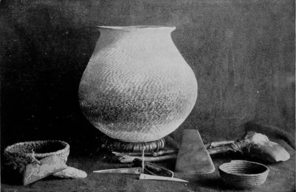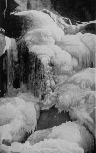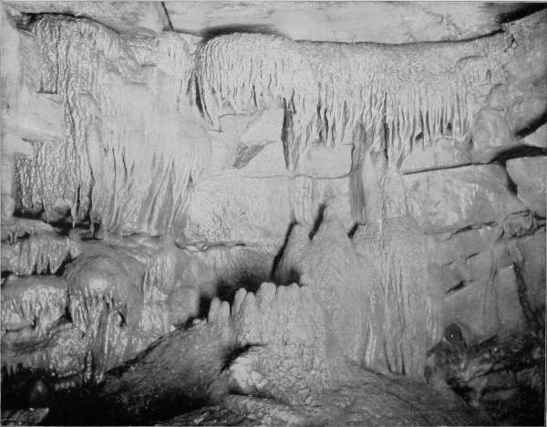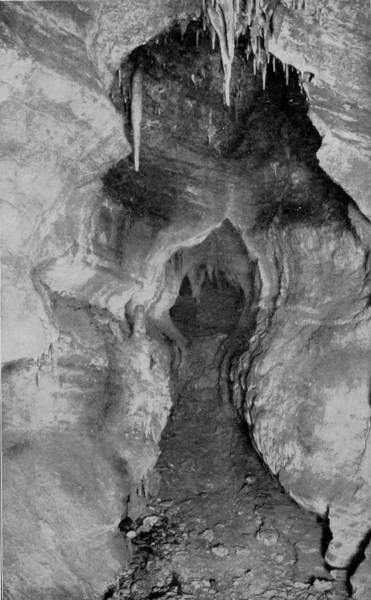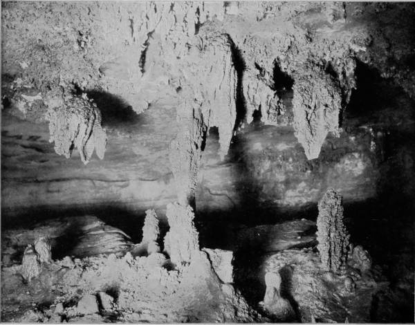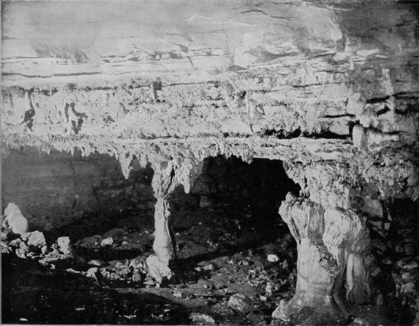 Mammoth Cave first came into notice and importance about the year 1812, when it was discovered that the cave contained vast beds of niter, sufficient, as was stated at the time, to supply the whole population of the globe with saltpeter. Gratz and Williams were the owners, and established a very large industry in collecting the nitrous earth by means of ox-carts and shipping it to Philadelphia, where it was used in manufacturing the gun-powder that enabled us to triumph over England a second time. The region is essentially cavernous, as Professor Shaler estimates that in this carboniferous limestone district of Kentucky “there are at least 100,000 miles of open caverns,” but very few of the five hundred caves and grottoes of Edmondson county contain nitrous earth. On the other hand, there have been very few evidences of prehistoric occupancy discovered in Mammoth Cave, while in Salt Cave, its neighbor, and almost a rival in size, archæologic remains, such as fire-places, burnt torches, sandals, and moccasin-prints are numerous; and in Short Cave, also near-by, the mummified bodies of several small animals and a few human remains have been found. White Cave is half a mile from the Mammoth Cave entrance, and the two may be connected, though the communication has not been discovered. But there is a decided difference in the formations that characterize the two. White Cave is in some respects similar to Luray Caverns in its exquisitely charming variety of stalactites. In the first chamber, “Little Bat Room,” as it is called, we find many lovely creations and a few objects of great interest to paleontologists. In the second room is a piece of stalactitic drapery, which has been very appropriately called the “Frozen Cascade.” “Humboldt’s Pillar” and “Bishop’s Dome” are other wonderful examples of the effects of slowly percolating water bearing lime in solution. In this same cave, some seventy years ago, were found huge fossil bones, of the megalonyx, or giant sloth, bear, bison, and stag, and scattered among these animal remains were a few human bones.