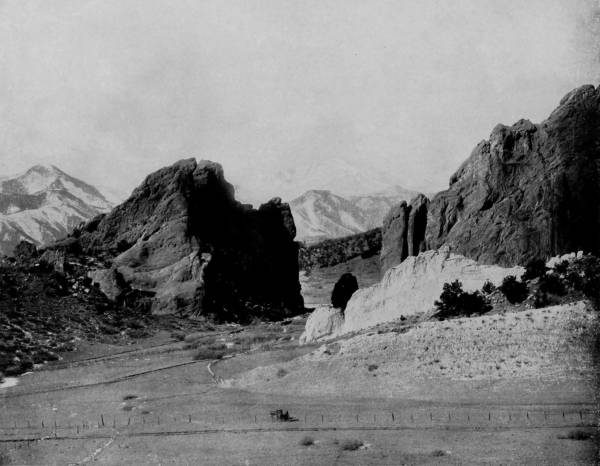 Enthusiasm sometimes exaggerates the reality, just as colored glass confuses the sight; but when it serves to please without doing harm, the fault may be pardoned. To the enthusiasm of the occasion, and our great and unique enterprise, may therefore be charged the burst of admiration that manifested our feelings, when, rolling along the prairies on the Union Pacific R. R., we saw, rising far to the southwest, nearly one hundred miles away, the broad shoulders of Pike’s Peak, breaking into russet above the clouds and showing a head of saffron, mellowed by the soft rays of a sun just falling into the deep valleys of the Occident. It was the chief object to chain our attention for the while, and this first impression awakened most delightful anticipations of the work which lay before us. A few hours later we were in Denver, making final preparations for a photographing tour of the picturesque West. Fortunately, our arrangements were so nearly complete upon leaving St. Louis that only a short stay in Denver was necessary, and it was with eager desire that we had our car attached to a Union Pacific train and started for the heart of the Rockies. The long range of mountains, rising into sharp peaks, and again spreading their tops into truncated cones, elbowing and pushing each other like a brigade in too close quarters at parade-rest, are only fifteen miles from Denver, forming a grand background to an immense 18expanse of prairie landscape. Starting on the Colorado Central Branch of the Union Pacific, we soon pass through the gate-way of the Rockies; thence on to Golden, a beautiful mining town that nestles in the bed of a dried-up lake, and looks up with pleasing satisfaction to the guardian gods of North and South Table Mountains. Here a stop is made for a trip up Bear Creek Cañon, which is reached by stage, by which conveyance the traveler is trundled into a gorge of surpassing beauty and noble grandeur. Through this great gash the water dashes, swollen by melting snows, and fed by a thousand sources. On either side the frowning and dusky walls, weaving a tortuous way like the path of a drunken giant, rear up their castellated heads until they remind us of the walled cities of Jericho, over which Joshua’s spies were lowered by Rahab.