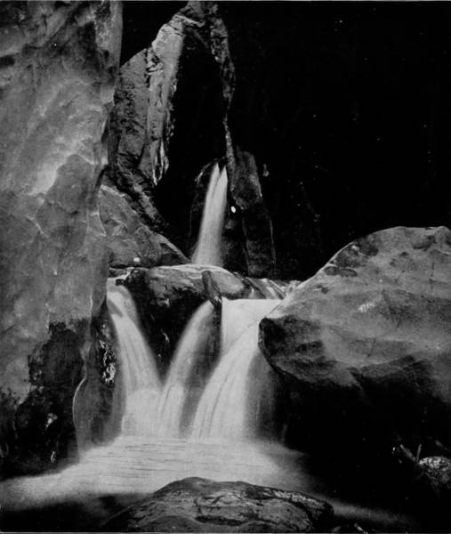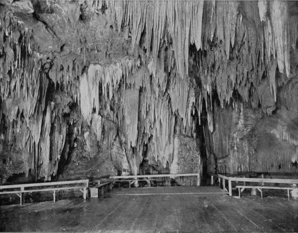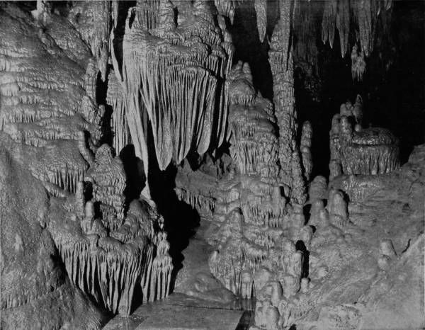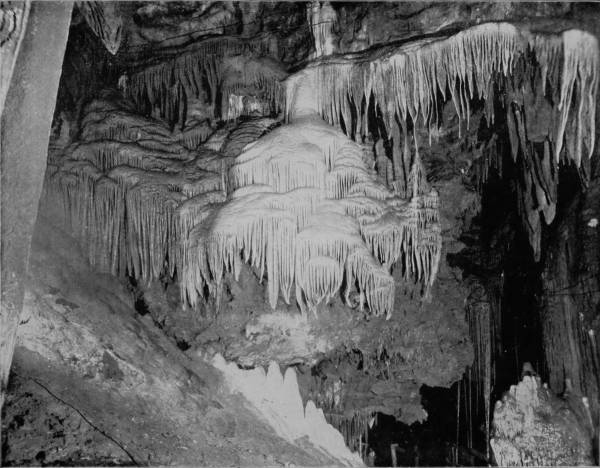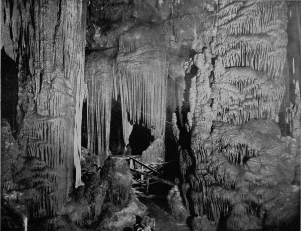 Having concluded our examination of Mammoth Cave, we departed by the Louisville and Nashville Railroad for Louisville, at which city train was taken on the St. Louis Air Line for Wyandotte Cave, which was to be our last objective point in completing our extensive photographic tour of America. This very remarkable Cave, though not so generally known as Luray or Mammoth, is about ten miles south of the Louisville and St. Louis Air Line, in Crawford county, Indiana, and is only five miles from the Ohio River. We reached the Cave by way of Milltown, thence to Corydon, and from that point by private conveyance a distance of eleven miles. Entrance to the Cave is by way of a large opening in a hillside, the aperture being about six feet high and twenty feet wide, through which there is always a strong circulation of air like that noted at the mouth of Mammoth Cave, while the temperature is likewise uniformly 54° Fahrenheit. A short avenue leads into a chamber known as Fanueil Hall, whose dimensions are 200 feet long, 50 feet wide and 25 feet high; thence the route conducts through Twilight Hall into Columbian Arch, which resembles a railroad tunnel, so symmetrical is the excavation. Washington Avenue is next entered, which, followed, brings the visitor to Banditti Hall, where the ceiling rises to an immense height, and the walls are jagged, as is the floor, with protruding rocks, so that this chamber is both forbidding in appearance and difficult to traverse. At this point the main gallery branches, one avenue leading to what is known as the Old Cave, and the other conducting by a longer route to more interesting apartments than those before passed. Through a narrow crevice the visitor gains a room called the Bats’ Lodge, and beyond this is Rugged Mountain, which is in the center of a circular room, where Epsom salts of sparkling purity and vast quantities of gypsum in efflorescent beauty cover the arched vault. Seen under torch-light the effect is indescribably magnificent, and is the first striking intimation which the visitor receives of the extraordinary grandeur to which he will be presently introduced. Following the long route we cross a lovely sand-deposit known as the Plain, but find an abrupt termination of this level walk and are compelled to climb the rock-bestrewn Hill of Difficulty, then squeeze through a small passage-way from which we find present relief by emerging into Wallace’s Grand Dome, one of the most magnificent chambers, as well as the largest, in the Cave, being 245 feet high and 300 feet in diameter. In the center is Monument Mountain, a tremendous stalagmite formation above which is an immense dome beflowered with curling leaves of gypsum that bear a wondrous likeness to the foliage of the acanthus. At the apex of the mountain is a stalagmite one hundred and twenty feet in circumference, which has been broken by some force into three columns, which, viewed from the base, admirably counterfeit three monuments, or ghosts clad in robes of gleaming whiteness, from which fact the chamber takes its name. Visitors are usually treated to a superbly grand sight while examining the splendors of this hall, for the guide disposes his company about the base of the mountain, and ascending to the summit he extinguishes his torch in order to bring the visitors under the influence of dense darkness for a few moments. Suddenly the peak is lighted up with a dazzling splendor, as the guide touches off green, blue, red and orange lights, bathing the chamber in a sea of flaming beauty and bejewelling its lofty arch until Aladdin’s Cave of our imagination is reproduced.