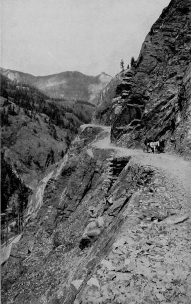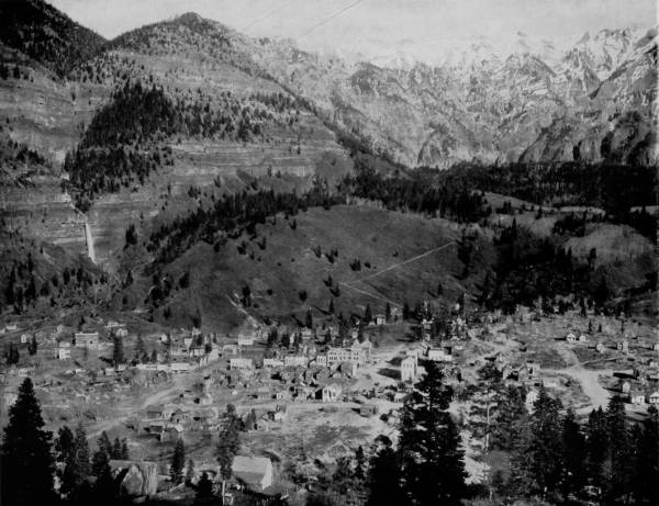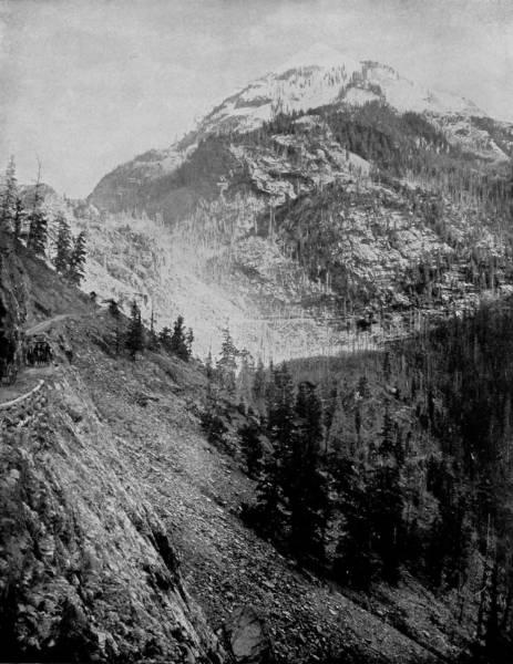 As we emerge from the tunnel, and creep around the perpendicular side of the mountain on a roadway barely wide enough to accommodate a single train of cars, a bewilderingly magnificent panorama opens to us. Away towards the southwest, one hundred and fifty miles, we observe the lofty and regular heads of the San Juan range, while a little further west we are able to distinguish Uncompaghre Peak, that looks down with benignant aspect upon the town of Ouray. There, too, is the green and happy valley of the Gunnison, towards the end of which we see Elk Mountains and their chief peaks, Mount Gothic and Crested Butte.