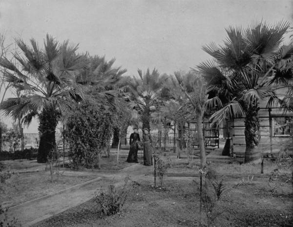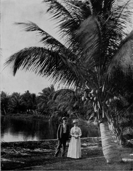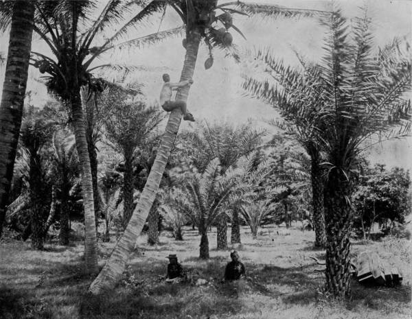 Twenty-five miles below Eden is Jupiter, the southern termination of Indian River, a little town that derives its importance from the Government light-house which stands before the inlet to warn vessels off the dangerous reefs outside. The surroundings, however, are very delightful, especially the beach, which is strewn with the prettiest ocean-shells that ever a pensive person gathered, including an occasional pearly nautilus, a perfect one of which we had the good fortune to find. Near-by is the Spouting Rock, a coquina formation that rises into a bank and which has been hollowed at the base by incessant dashing of the billows. Into this grotto the waves plunge with such force that they drive out through an opening in the top of the rock like a colossal fountain, and are scattered by the winds into a shower of rainbows. A narrow-gauge railroad runs south from Jupiter, a distance of eight miles, to Juno, its terminus on Lake Worth, where tourists take a steam launch for Palm Beach and are then in the land of the cocoanut. The voice of eloquence grows coarse when it attempts to paint the beauties of this o’er fair summer-land; a land where warm zephyrs stir the hazy air with breath of perpetual bloom, and sensuous perfumes fan the cheeks of languorous day. In this Arcadian spot of beauty, where the air is passionate as a lover, wooing and kissing the flowers, tossing and embracing the fronds of the cocoa-trees, there is a joy like retrospection; a communion with the rapturous soul of nature; a commingling with the creatures of our sweetest fancy; a balmy, delicious sense of gratification that lulls and etherealizes; that bridges the gulf between the real and the ideal; that builds substantial castles in clouds of gold, and makes everything a slave to our desires. The banks are pictures of beauty, the gardens are beds of perennial delight. Lake Worth is separated from the ocean by a strip of land less than half a mile wide, and this narrow tongue of what was once bare sand has been converted into a stretch of tropical exuberance. For a distance of four miles there is an unbroken glade of cocoanut-trees, while nearer to the sea-shore are banana groves, and trees bending to the ground with guavas, sapodillas, oranges, lemons and other tropical fruits. At intervals there are gardens full-bearing in February with beans, peas, tomatoes, and along the walks are flower-beds that flame with color and lade the atmosphere with nature’s incense. To walk through such a grove of fruitful delight is to fill the heart with ecstasy.