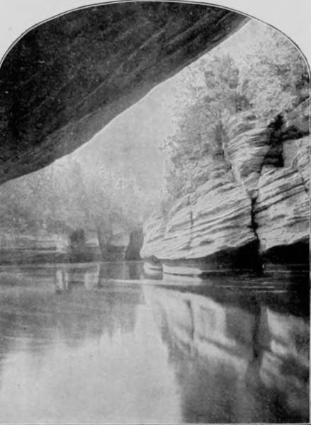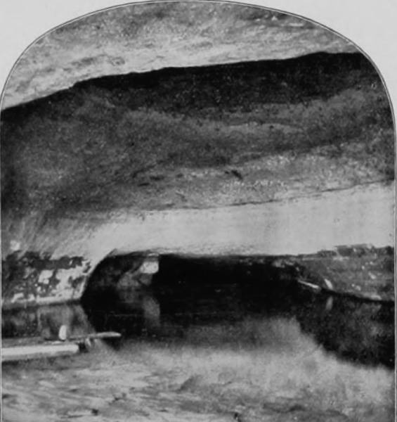 The waters, entering through numerous domes and pits, and falling, during the rainy season, in cascades of great volume, are finally collected in River Hall, where they form several extensive lakes, or rivers, whose connection with Green River is known to be in two deep springs appearing under arches on its margin. Whenever there is a freshet in Green River the streams in the cave are joined in a continuous body of water, the rise sometimes being as much as sixty feet above the low-water mark. The subsidence within is less rapid than the rise; and the streams are impassable during a greater part of the year. They are usually navigable from May to October, and furnish exceedingly interesting as well as novel features of cave scenery. The largest body of water is called the Dead Sea, embraced within a basin formed by cliffs sixty feet high, above which a path has been made which leads to a stairway and thence to the River Styx, a body of water that is four hundred feet long and forty feet wide. Lake Lethe is the next water-basin, enclosed by walls ninety feet high, below which is a path that conducts to a pontoon at the neck of the lake. Thence a beach of the finest yellow sand extends for 500 yards to Echo River, the largest of all, being nearly one mile long, from 20 to 200 feet broad, and varying in depth from 10 to 40 feet. Two or three boats are placed on this Lethean or Stygian stream, in which visitors are taken from one end of the river to the other, and the trip is of such novelty that the remembrance of it is imperishable. To see the boats approaching, in the weird light of flickering torches, is like a vision of a spectral crew, funereal, sepulchral and almost horrific. The arch overhead is symmetrical but irregular in height, and is famous for its musical reverberations—not a distinct echo, for the repetitions are so rapid that they merge and become a prolongation of sound that continues for nearly half a minute. The long vault has a certain key-note of its own, which, when sounded, produces harmonies of almost incredible depth and sweetness.