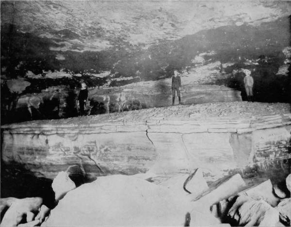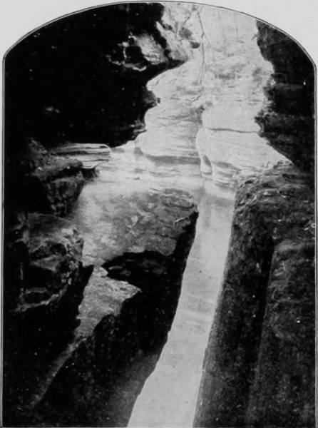 A block of stone that is forty feet long by twenty feet wide is called the Giant’s Coffin, and when viewed from a certain angle the resemblance to a funeral casket is so great that even if attention were not called to it, visitors would hardly fail to be a little shocked by the sight. There is a narrow passage-way around the coffin, which followed leads to a large vault called Gorin’s Dome, in which there are six pits varying in depth from 65 to 220 feet; truly, awful pits to fall into. Notwithstanding the treacherous character of the floor, Gorin’s Dome is one of the finest chambers in the Cave, for it is charmingly festooned and pillared with stalactitic formations. Mammoth Dome, which is at the termination of Sparks Avenue, is probably more interesting, because besides having its walls draped with a marvelous tapestry, the great wonder of the room is immensely increased and beautified by a cataract, which falls from a height of 250 feet and fills the apartment with its musical splashings. The Egyptian Temple, which is a continuation of the Mammoth Dome, contains six massive columns, two of which are quite perfect and eighty feet high by twenty-five feet in diameter. Lucy’s Dome, which is three hundred feet high, is the loftiest of these monster shafts, the equal of which cannot be found in any known cave in the world.