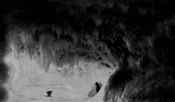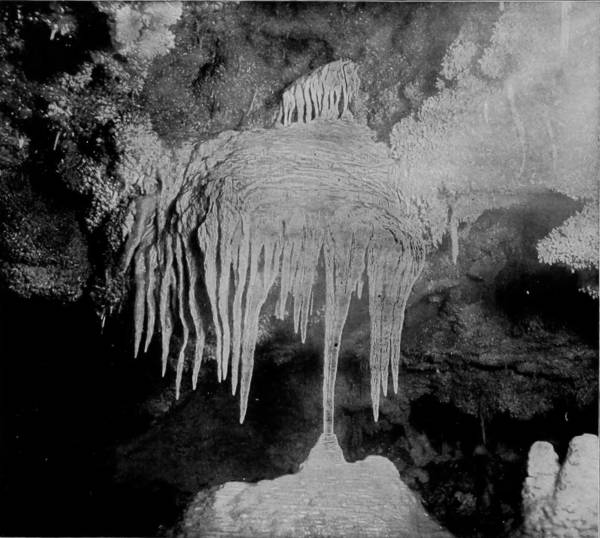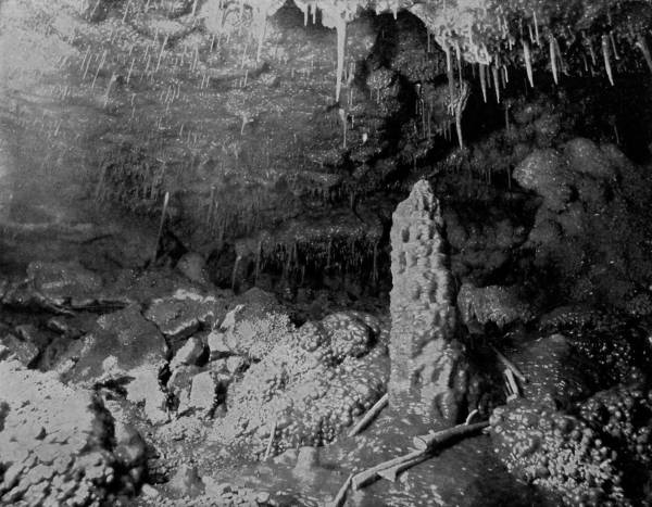 “Before us arose a considerable hill, upon the top of which stood, like a column supporting the ceiling, a vast stalagmite like an immense spectral-looking iceberg looming up before us, appearing as though it had just arisen from the foaming waves of the ocean, on a dark and foggy night. In the uncertain light of our lamps it presented an appearance grand, if not appalling; but when the Drummond light had been set off, all this changed to the most unearthly beauty. The ceiling above, with its long fringes of stalactites, came out to view, and the great pillar could be seen in all its grandeur and beauty.”