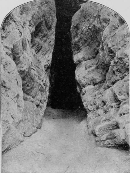 494The entrance to Mammoth Cave is arched by a rock-span of seventy feet, thence leading by an easy descent down a winding flight of stone steps to a narrow passage through which the air rushes outward with great force in summer and is drawn inward with corresponding violence during the winter, a phenomenon due to the inequality of temperature between the air inside and out of the Cave, for the temperature of the Cave is uniformly 54° Fahrenheit at all times. The atmosphere being thus constantly agitated, is kept constantly pure, for while the lower levels are moist, being no doubt connected with Green River, the upper avenues and galleries are always dry; conditions which were one time thought to be particularly favorable to consumptives, as well as to those suffering from other wasting diseases. The experiment was therefore made, some forty years ago, of building thirteen stone houses at a point one mile within the Cave, in which a number of invalids took up their domicile and lived there in deep seclusion until it was demonstrated that whatever might be the salubrity of the atmosphere, consumptives derived no benefit from it, a number dying in the Cave. Relics of two of these stone huts still remain, but they exist now only as curiosities, no one having spent a night in one of them for many years.
