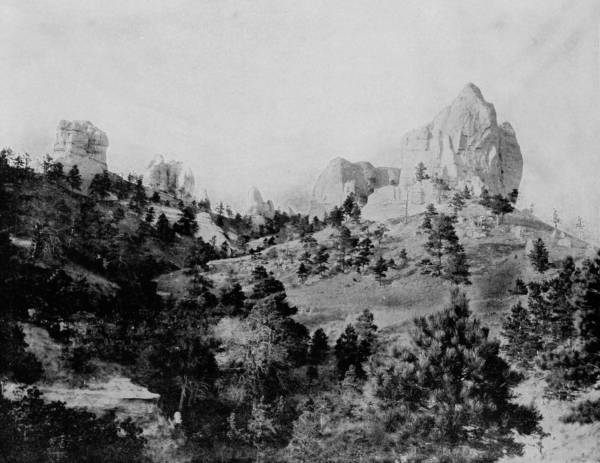 Continuing our trip, therefore, towards the southwest, our first stop was in Platte Cañon, which is twenty miles from Denver, and there many exquisite views were taken. This cañon, formed by the Platte River, resembles Clear Creek Cañon, but is longer and somewhat wilder. The route is over Kenosha Hill, which is Alpine in its grandeur, and so rugged that the road is as sinuous as the trail of a serpent. The cañon spreads at places until it runs between gradually sloping steeps, but again the walls draw closer, and rise perpendicularly to a sheer height of a thousand feet, excluding the sunlight except as it is strained at times through a narrow rift, until it looks like a pencil of light cleaving the pall of night. What mighty forces were gathered here in the age of the world’s infancy! what terrific convulsions and frenzied spasms of nature that rent in twain the earth’s envelope and left cañons and mountains where once were lake and plain!