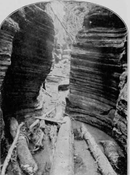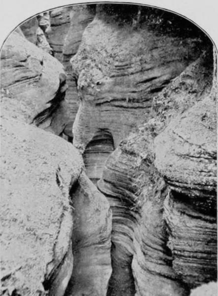 Many small rooms and tortuous paths, where danger lies, are avoided as much as possible; but even on the regular routes through the Cave some disagreeable experiences are inevitable, while about the deep pits peril is always present. The one now known as the Bottomless Pit was for many years a barrier to all further exploration, and until a substantial wooden bridge was built across it. Long before the shaft had been cut as deep as now, the water flowed away by a channel gradually contracting until at a point called The Fat Man’s Misery the walls were only eighteen inches apart. The rocky sides are beautifully marked with waves and ripples, as if running water had been suddenly petrified. This winding-way conducts to River Hall, beyond which lie the crystalline gardens that have been described. It was formerly believed that if this narrow passage were closed, escape would be impossible; but a few years ago a tortuous fissure called the Cork-Screw was discovered, by means of which a good climber ascending a few hundred feet finally lands 1,000 yards from the mouth of the Cave, and cuts off nearly two miles.