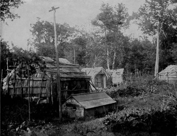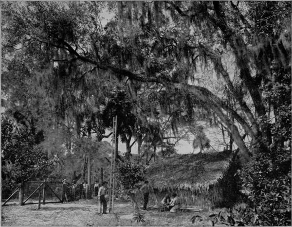 HOME OF THE ORANGE-PICKERS IN FLORIDA.—A curiosity peculiar to Florida, and the tropics generally, is the palmetto hut, an unsubstantial structure roofed and “weather-boarded” with palmetto leaves, but furnishing ample protection from sun and rain. These huts are usually built to serve as temporary abodes for orange-pickers, and are therefore generally within or near the groves. It is the custom to sell the orange crop on the trees, the purchasers being usually fruit dealers from the North. These dealers employ trained pickers, who work throughout the season, going from one grove to another until the gathering is completed. These pickers generally provide their own supplies, likewise their shelter, and the palmetto hut serves them both well and economically.