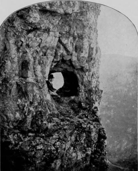 GIANT’S COFFIN, MAMMOTH CAVE, KENTUCKY.—This remarkable and weird curiosity is composed of a huge block of stone forty feet long by twenty wide, and when viewed from a certain angle the resemblance to a funeral casket is so great that, even if attention were not called to it, visitors would hardly fail to be a little shocked by the uncanny sight. Standing within its presence it is almost impossible to divest one’s self of the belief that he is gazing upon the last resting-place of some tremendous giant, the guardian genius, perhaps, of this lugubrious subterranean abode; and it is with a sigh of relief that we pass on to more inspiring and splendid scenery.