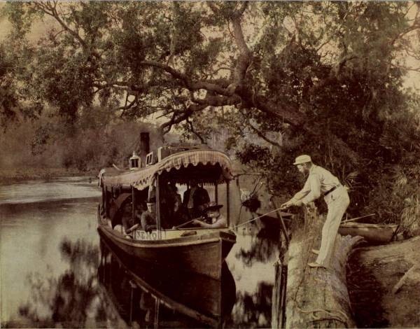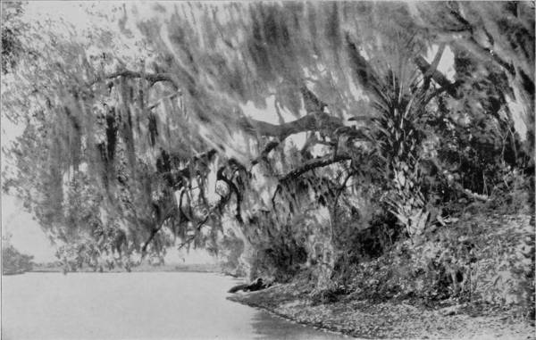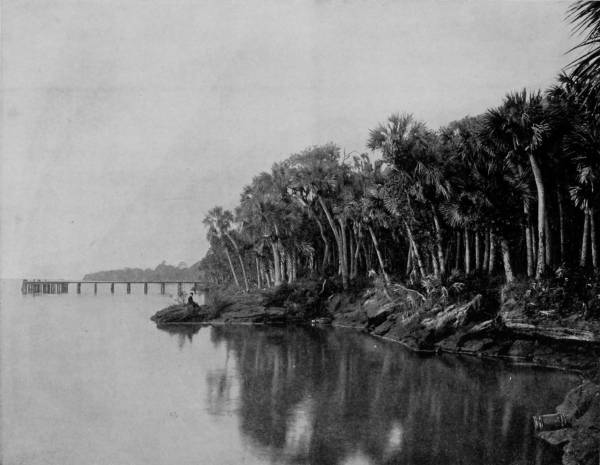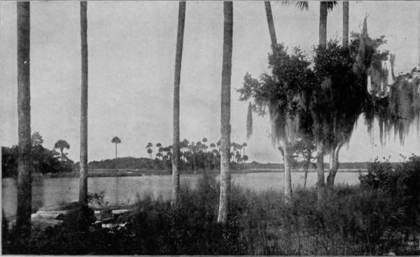 At Ormond boat was taken for a trip down Indian River, a journey which all the speech of adjective and imagery cannot justly describe. Indian River and Halifax River are not streams, but shallow lagoons, strips of the ocean enclosed by narrow tongues of sandy beach, severed by occasional inlets through which the billows break tumultuously. Its extreme length, for the two are now joined by a canal, is about two hundred miles, and though rarely more than three feet deep, and in places less, the lagoon is navigated by a line of stern-wheel boats, which, in winter-time, are crowded with excursionists, notwithstanding their sleeping accommodations are confined almost entirely to cots in the cabins. One line runs to Titusville, and there connects with another, which carries passengers as far south as Jupiter, the southern limit of the river. In the last year (1892) a railroad has been built from Titusville to Rockledge, and is being pushed southward, so that in another year or two the trip to Jupiter may be made by rail. But the boat journey, though beset by some harassments, consequent upon narrow passages and low water, will lose little of its popularity, because it will always remain one of the most delightful that can be taken. The connection between Halifax and Indian Rivers is by means of a canal that requires constant dredging, and through which it is difficult to pass with boat when the wind is blowing hard; while at times it is so choked with sand that the boats have to be literally dragged through by means of hawser and capstan. New Smyrna is a town of some importance, as is Titusville, but besides these, the landings are of no consequence as trading-places, consisting of never more than one or two stores and as many houses. This sparseness of population increases the interest of travelers on the river, for the charm of primeval beauty and attractiveness thus remains.