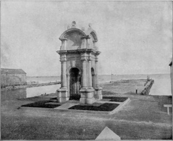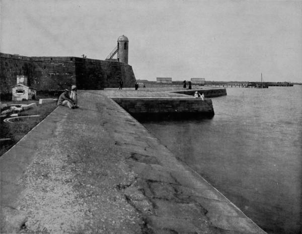 But the interest to St. Augustine visitors is not confined to the Ponce de Leon, glorious as it is, joined though it be to its almost equally superb annexes, the Cordova and Alcazar, for the city is filled with the relics of an olden time, and associations that are almost painful to recall. Along its water-front extends a sea wall one mile in length and ten feet broad, built of coquina and coped with granite, forming an incomparable promenade between the old Franciscan monastery, now used as a barracks, and the ancient fort of San Marco, now known as Fort Marion. Though not the most formidable, these antique fortifications rank all others of this country in interest. Their construction was begun by Menendez de Aviles in 1565, at the time of the founding, but were not completed until two centuries later, all of the work being performed by enslaved Indians. The fortifications cover about four acres, and the walls are of coquina, a conglomerate of shells and sand brought from Anastasia Island, which, soft when dug, hardens by exposure. The fort is a splendid example of the best military architecture of the time, being in the shape of a trapezium, surrounded by a wide and deep moat, and with walls twenty-one feet high, sharp bastions at the corners, thick casemates, and subterranean passages and vaults which might serve equally for refuge ports or dungeons. That some of these were used for the latter purpose is proved by the fact that in one of the least accessible dungeon-rooms, the entrance to which was accidentally found, two skeletons chained to the wall were discovered. What a story of suffering these might tell if they could speak!
