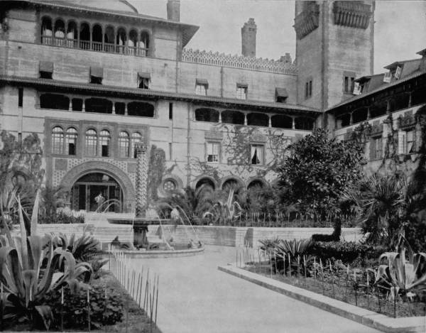 PONCE DE LEON HOTEL, ST. AUGUSTINE, FLORIDA.—This photograph represents the court of the hotel, around which the walls extend in the form of a hollow square. The hotel itself is a revival of the richest examples of Moorish architecture. It is old Spain of the golden reign of Ibn-l-Ahmar transported to American shores. With its lavish adornment, picturesque style and exquisite grounds, in which every known tropical plant is made to add its beauty and shed its fragrance, while flowing fountains cool the summer air, the Ponce de Leon is not only a reminder of the great palace of Spain in the time of Columbus, but it is also one of the best representatives of modern convenience, comfort and artistic beauty of architecture and construction.