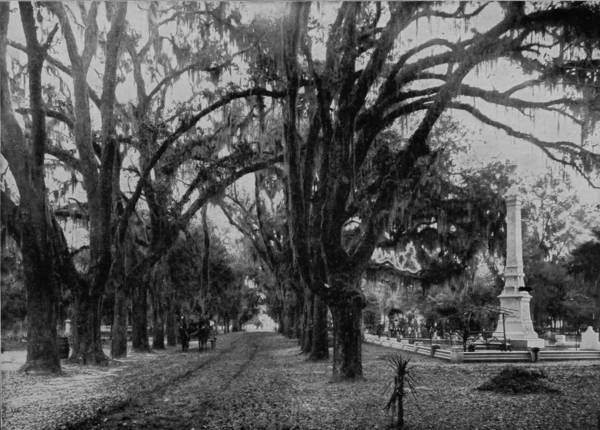 The city is situated on a bold bluff overlooking the Savannah River, along which it extends in a curved front for a distance of three miles, affording excellent wharfage. The streets are all very broad and magnificently shaded, while parks containing one to three acres occur at all the principal intersections, charmingly laid out and beautified with flowers, which grow in that warm climate in the richest profusion. Flower gardens constitute one of the most characteristic features of the place, for a majority of the residences are surrounded by ample grounds that are abloom with flowering plants throughout the year. This is the borderland of southern evergreens, where the stately oak is festooned with pearl-gray mosses, and the orange and the magnolia fill the air with delicious perfumes. Along the streets, too, are rows of flowering oleanders, pomegranates, palmettos, bananas, laurels, bays and sweet crape-myrtles. But of all the beauties about Savannah none rival the charms of Bonaventure Cemetery, four miles from the city, on Warsaw River, and reached by a shell road that is equal to any drive-way in the world. Every grave is a flower-bed, and the long avenues canopied with moss-garlanded oaks present a picture Arcadian in its loveliness, and suggestive of those flowery glades through which immortals might delight to wander.