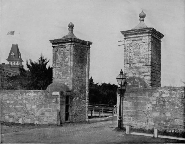 OLD CITY GATES, ST. AUGUSTINE, FLORIDA.—As St. Augustine is the oldest town in America, having been founded by the Spaniards in 1565, it is quite natural that we should find here many relics of the past mingled with the bright and better features of modern life. The old city was surrounded by a wall as security against attacks from the outside, and of this wall the gates, so beautifully photographed on this page, are about the only remaining relics. It is one of the links connecting the present with the earliest events of discovery in our country—a link rusty with the blood of conquest and martyrdom. Here it was that Spanish cruelty and French retaliation were carried to the most barbaric extreme, and cruelty is always in need of strong walls to protect it from the enemies it creates and nourishes.