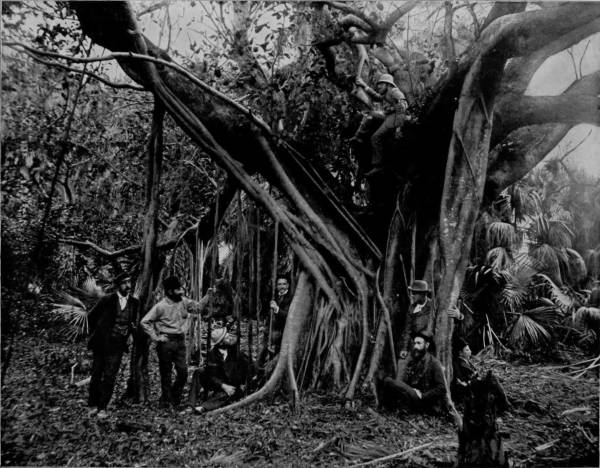 RUBBER OR BANYAN TREE, ON BANANA RIVER, FLORIDA.—We are now among the wonders of the semi-tropics and the paradisaic delights of a marvelous sun-browned land, where the mocking bird opens the matin competition in the college of vernal hymns, and the palmettos are vocal with the softly stirring breeze. The landscape is a dreamy haze of incomparable loveliness, where a feast of flowers is perpetually spread, and the voice of peris may be heard down under the green waters of a murmuring sea. The ocean is so near that the music of its rolling beach comes like a gentle lullaby through the clustering branches of the scented trees, bringing the hush of the still small voice that reminds us of the presence of Deity.