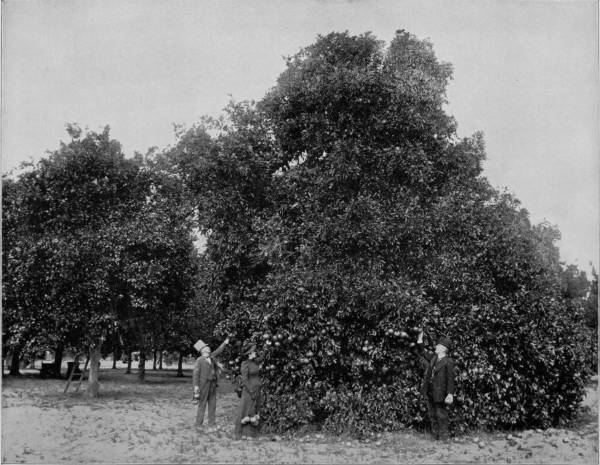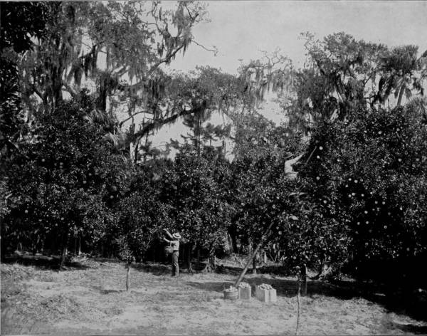 AN ORANGE GROVE NEAR PALATKA, FLORIDA.—A full-grown orange tree, loaded to the ground with its yellow, ripe, luscious fruit, is a delightful object to gaze upon. Oranges do not drop from the trees of their own accord as soon as they are matured, like most other fruits, but they hang by the stem until they are plucked off, and it is said that the longer they remain the sweeter and juicier do they become. Experience seems to prove the truth of this theory, for we have never eaten oranges elsewhere so deliciously sweet as when we took them from the tree with our own hands and ate them on the spot. Owing to the peculiarity of the fruit it is no uncommon thing to see ripe oranges on a tree that is in full bloom for another crop.