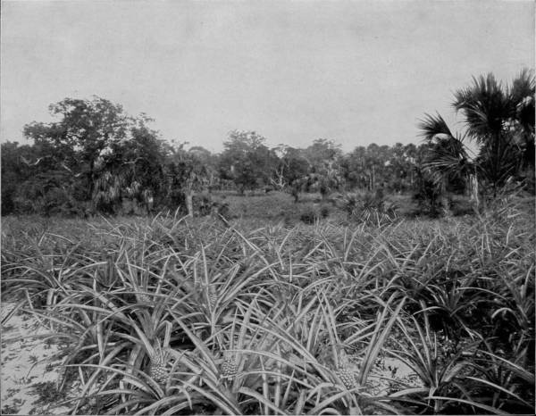 A PINEAPPLE GROVE ON INDIAN RIVER, FLORIDA.—A pineapple grove is one of the most enjoyable places in the world. The broad green blades of the plants, the golden reddish yellow fruit, and the pleasant odor that fills the air form a combination of the most delightful character. No one can fully appreciate the delicious flavor of the pineapple until he has plucked it ripe from the plant and eaten it on the spot. The fruit that goes to market is cut when only half ripe, and thus loses the best part of its flavor, and is spongy and tough in comparison with that which is allowed to mature before being gathered.