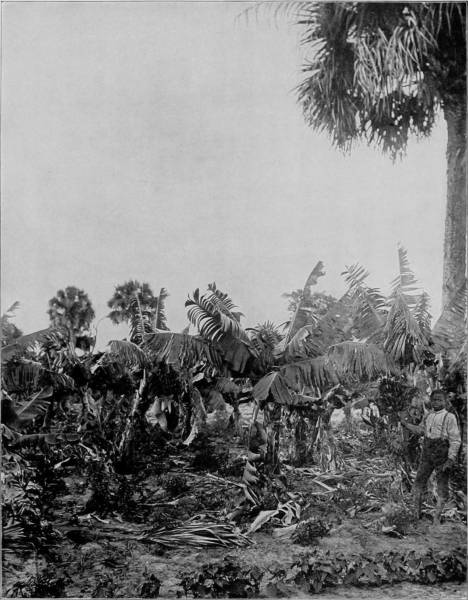 A BANANA GROVE IN FLORIDA.—The banana plant is one of the most beautiful growths that can be imagined. Its broad, luxuriant leaves are of a bright green color, changing to maroon and orange as the season advances and the fruit begins to ripen. The latter, when it reaches the delicious yellow stage of full maturity, does its part in helping to dress the field in the most beautiful livery of nature, presenting a scene of gold, green and maroon surpassing the powers of pen or pencil to depict or portray. The Spaniards, from a fancied resemblance of the transverse section to a cross, supposed the banana to have been the forbidden fruit, and that Adam saw in eating it the mystery of redemption by the cross.