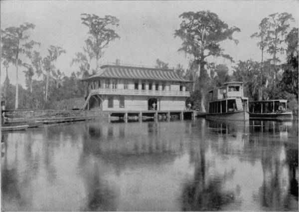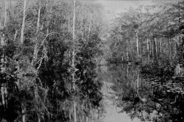 At Palatka we took boat for an excursion up the Ocklawaha River to Silver Spring and Ocala, the head of navigation on that stream. Of our many trips in the East, West and South, this proved to be the most unique, the most wonderful, the most sensationally picturesque. Ocklawaha River is at once a lagoon, a narrow lake, and a swamp, but at no place does it have the appearance of a flowing stream, for the current is scarcely perceptible. The shore-line is indicated by a profuse growth of water-vegetation and cypress knees, while at places the river is so narrow that lofty trees interlace their branches above the low smoke-stack of the boat. And what a boat! It is well adapted to the trade, and to that end is unlike any other steamer that ever sat in the water, a thing of indescribable shape, an object of surprise and curiosity. On this queer craft fifty people may ride in comfort during the day, while attention is attracted by the alligators, cranes, loons and snake-birds along the shore, but the night must be spent in vain regrets and fighting mosquitoes. No chance to get lonesome on this trip; there is too much to see in day-time and too much to do at night. But it is a novelty, an experience, a sensation worth more than the discomforts that must be endured. Along the Ocklawaha alligators are still plentiful, because shooting is not allowed from the boat, and there is no other way to approach them within gun-shot distance. The lazy monsters may be seen sunning their corrugated backs on nearly every log, and in their company huge water-snakes are often found, associated with big and little snapping-turtles, the three species forming a congenial but most repulsive family of reptilian cousinship. The water being half-stagnant is black with a vegetable dissolution, and yet so transparent that the bottom may at times be seen. But if the creatures that haunt the river are offensive, the sight is compensated by the wonder which they excite; while the dense woods that margin the shore are resonant with the carol of birds and jewelled with their brilliant plumage.