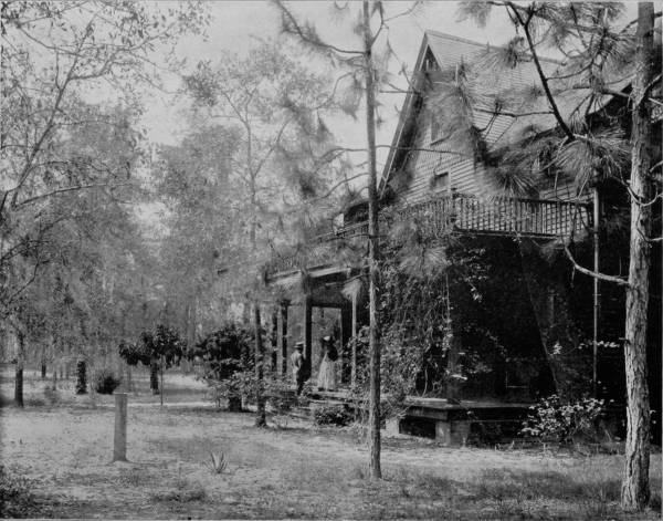 A HOME IN THE SHADES OF SOUTHERN PINES.—If Ponce de Leon and his doughty Spaniards had remained in Florida and built them homes like this, under the shades of the health-giving pines, instead of wading through swamps and morasses in quest of the fountain of youth, they might, and probably would, have lived to be hale and hearty old men. Abodes like this, in the balmy air of the Sunny South, are fountains of life within themselves, where, free from worry and the necessity of making a living, one has but little to do aside from living and growing and being happy. Such homes, with contentment, are more worthy of being sought after than the wealth of a thousand Crœsuses.