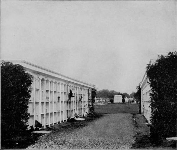 New Orleans is a very old city, settled by the French in 1718. Like other settlements of these early times, it has passed through many evil vicissitudes and been in turn a possession of France, Spain, and the United States. A singular thing in connection with the city is the fact that it is built upon ground that is considerably lower than the surface of the Mississippi during high water, and that it has no more substantial foundation than an alluvium deposit which has been going on for centuries, constantly extending into the Gulf, the point of outlet of the Mississippi. To prevent overflowing, the city is protected by a dyke, or levee, which is fifteen feet wide and fourteen feet high. This earth-wall follows the river’s crescent winding a distance of ten miles, while another extends across the rear to protect the city from Lake Pontchartrain. To secure a firm foundation for some of the large buildings, cotton-bales have been used on which to build, as piling is of no service. But that this character of basis is no disadvantage is proven by the fact that New Orleans is noted for its mammoth edifices, public, church and commercial, which give no sign of insecurity. The place is essentially cosmopolitan, for in no other city is the population more mixed, nearly every street being occupied by a different nationality. Commercially it is next to New York as an export city, and easily holds the honor of the leading cotton port of the country, from which one-fourth of the world’s supply is floated. She is likewise a city of many charms and great historic interest. Within the city proper occurred a terrible scene following the rebellion of 1763, when France ceded the place to Spain, while at its southern outskirts is the battle-field on which Jackson won his glorious victory over the British under Packenham, January 8, 1815. The city passed through another storm of shot and shell in 1862, when Farragut compelled its capitulation after a terrible bombardment. But these scars have long since healed, and New Orleans, despite plagues and wars, has held her position as Queen City of the South and one of the great metropoli of America, with a population now of 250,000, which is rapidly increasing. While New Orleans is famous for the romance with which her history is invested, for her immense importance as an export city, and also for the beauty of her parks and magnificence of her private residences, the curiosity of strangers is no less attracted by her cemeteries, which are unlike those of any others in the world. In earlier times it was the custom there to bury the dead in shallow graves, but this practice was finally abandoned for the more sacred and sanitary one of enclosing the bodies in tombs above the ground, and then hermetically sealing up the mortuary cell. This became a necessity because of the nature of the soil, where water is reached at a depth of two feet below the surface. Some of these tombs are mausoleums made of stone or iron and of beautiful architectural designs, but the more common form of disposition of the dead is in a wall pierced by cells large enough to contain a coffin, one above the other, to a height of seven or eight feet. There are thirty-three such cemeteries in New Orleans, in one of which (Greenwood) is a monument to the Confederate dead; and in another, the National, at Chalmette, the Union dead are similarly honored.