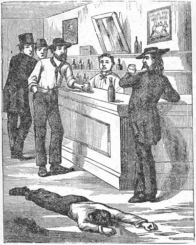 “Then take that,” said the stranger, drawing a pistol and shooting at Bill. The muzzle of the pistol63 was so close that the flash burned Bill’s face and the bullet struck him at the base of the hair on the left side of his forehead and cut out a furrow of flesh and hair. Bill fell unconscious, but the saloon-keeper coming in a moment after the shot was fired, threw some water in his face and consciousness was soon restored.
