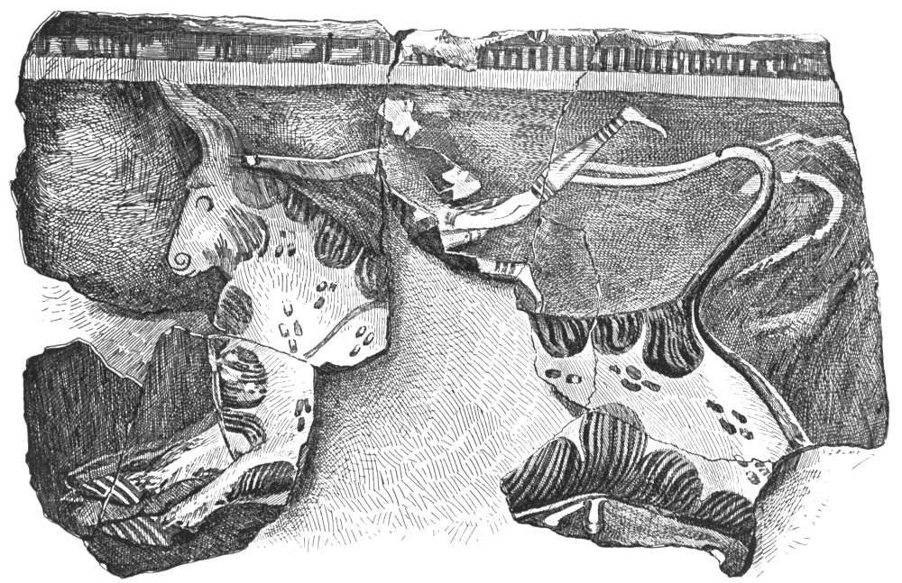 The only advantage that these varieties of wall painting seem to possess over the buon, or true fresco, process—and it may be considered as a questionable one—is, that as regards the number of the colours, the artist may use an almost unlimited or unrestricted palette, while in buon fresco his colours are limited to the very few which remain unchanged when subjected to the caustic action of the lime in the plaster. Tempera painting on walls has been so much mistaken for the fresco process that it is impossible to say when the latter was first practised, but according to the statements of{10} Vitruvius and Pliny, the process was well understood by the Greeks and Romans. Perhaps one of the most interesting revelations in the history of the art has been brought about by the discovery of several fragments of wall and ceiling decorations, found recently by the late Dr. Schliemann during the excavations of the ancient cities and palaces of the pre-Hellenic Mycene and Tiryns, of primitive Greece. One of these fragments of fresco painting, which was found in a palace at Tiryns, consisted of a portion of a wall or ceiling, a stucco slab, composed of lime and sand plaster, on which is painted the representation of a spirited bull with the figure of a man vaulting over its back. This interesting piece of work must have been executed at least as early as 1500 B.C., as the city of Tiryns was a mass of ruins shortly after this date. Many other fragments of fresco paintings have also been found in the ruins of these ancient palaces, some of which were decorated with linear and geometric ornament, conventional flowers, and animal forms. Not only were the walls and ceilings decorated with frescos, but the floors of some of the apartments were treated in a similar manner. Still earlier examples of fresco painting have been found in prehistoric Thera, one of the Grecian isles, and others in the Minoan palace at Cnossus, in Crete, both of which may have been painted as early as the nineteenth century B.C., and certainly not later than the eighteenth.
