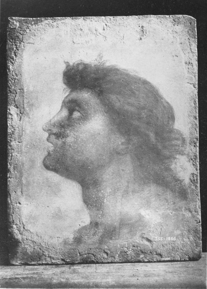 In beginning the painting of flesh and draperies on the wet plaster, or indeed in any other kind of wall painting, it is important to commence with a kind of modified outline. This, of course, applies also to any other prominent objects in the design or composition. It is therefore advisable that, before laying in the first masses of colours, the main features of the drawing should be outlined firmly with a sable brush, even if you modify or half-obliterate the outline when afterwards painting within it. Having outlined the portion selected for painting on the prepared light or cream-coloured ground, supposing it to be a head or other part of the human figure, a very good way to begin is to lay in the shadows first, using a soft or half-worn hog-hair brush, the shadow colour to be of a warm greenish tint, of a mixture of emerald oxide of chromium, raw sienna, and light red, used thinly to get transparency. Immediately after the shading, or modelling of the shadows, is accomplished a{26} general flesh-coloured tint is made, of a medium tone, and is swiftly brushed over the parts where the lights and half-tones would be, taking care that it is worked very thinly or sparingly into the shadows. This flesh-coloured tint ought to have a very little quantity of lime-white to render it semi-opaque. As soon as this is done the carnations of the cheeks and lips and colours of the eyes should be painted in. Then on the top of the general flesh tint the colours of the forehead, cheeks, and neck should be worked in, according to the colour of the sketch, gradually brightening the lighter parts and strengthening the shadows as required. For this second painting of the flesh the shade colour, modified of course according to the complexion and position it is to occupy, may be made of a mixture of raw sienna, light red, burnt sienna, and a very little emerald oxide. The same colours, with vermilion and lime-white added, may be used for lights and half-tones, and the transition tones between lights and half-tones may be obtained by lightly dragging the lighter tints over the half-tones, which operation usually produces the natural greyness required in these parts. For the darker markings of the nostrils, lips, eyes, and eyebrows, or any dark accentuations of the flesh tints, burnt umber used alone or mixed with a little vermilion, or burnt sienna, may be employed. Black may also be used for the same purpose if mixed with burnt sienna or vermilion. At this stage the flesh-coloured
