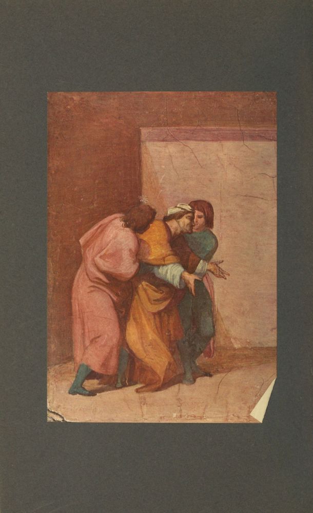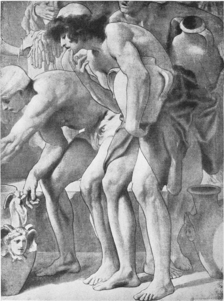 Before describing the method of laying on the last plaster ground, or intonaco, a few words must be said about the preparation of the design or subject to be painted. A finished coloured drawing or painting of the design, to a smaller, or even to the same scale as the fresco painting, must be prepared, and the artist should endeavour to make an exact copy of this on the plaster surface, as there is no time to experiment in colour schemes, or to make alterations from the original coloured design in the short period that is at the disposal of the painter when he is at work on the wet plaster. If the colour sketch of the work is prepared on a small scale it will be also necessary that a cartoon{17} in light and shade drawing should be made to the full scale of the fresco painting, before beginning to paint on the wall.