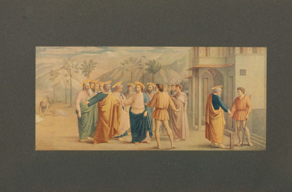 The portion of the design selected for the day’s painting is traced from the cartoon, and is transferred to the soft plaster through the holes, which are pricked through the tracing paper, by means of pouncing with powdered charcoal contained in a muslin bag, or it may have the outline traced through with a sharp-pointed wooden stile; this will leave a slightly depressed line on the soft plaster, and is a cleaner method than the charcoal pounce, and on the whole the more preferable one.