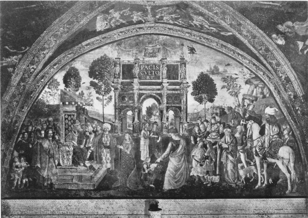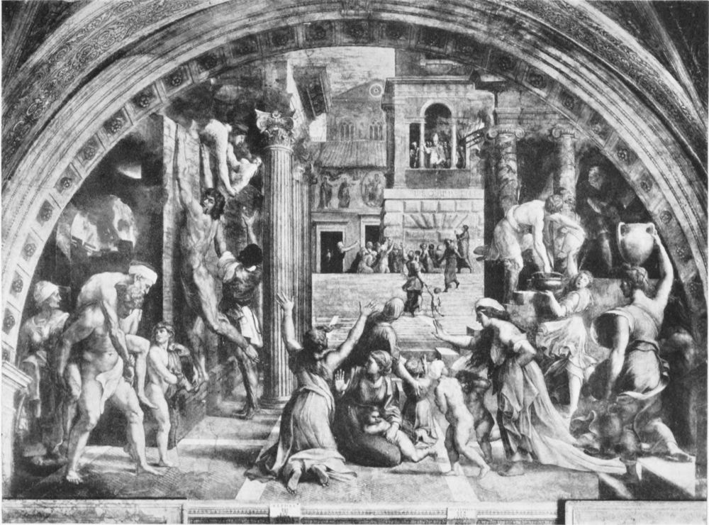 In a noble building the special functions of the three sister arts are clearly defined; each supplies its own distinct qualities of expression to make up the general artistic unity. The severe lines and proportional rhythm of the architecture are enriched by sculpture, which in its turn is chastened and modified by the contiguous severity of the former,{2} while painting adds the necessary colour finish to the bare spaces that are enclosed by the mouldings and constructional lines of the architecture, borrowing at the same time much of its dignity, restfulness of form, simplicity of composition, and whatever else that adds to its nobility and monumental fitness, from its close association with the architecture. Thus, while the three arts are each limited to their own special functions, they, at the same time, would appear to assimilate from each other what is lacking in themselves, and so contribute to the complete artistic harmony.