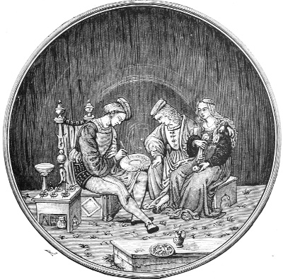 Children’s illustrated books of fairy tales have multiplied very much of late years, and in many of them is seen some 406of the old decorative feeling, where the text and illustrations are considered in an artistic relation to each other. This will also be noticed in many illustrations to poems which often appear in the monthly magazines of the present day.