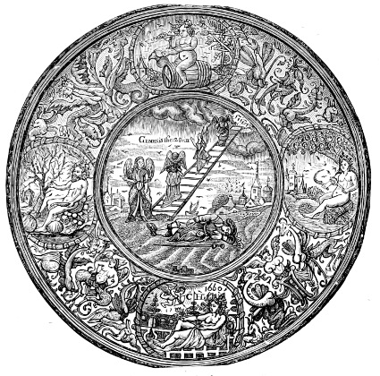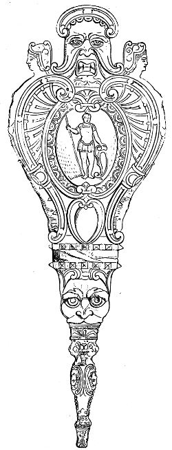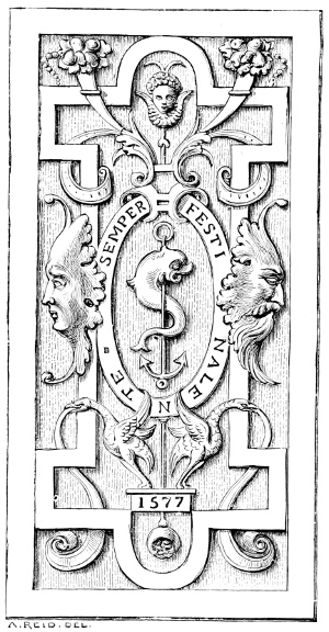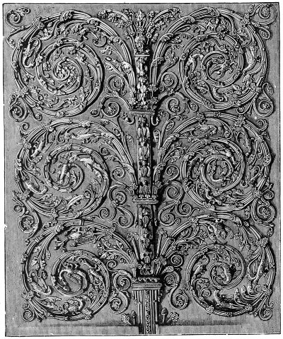 The strap-work and Oriental foliage designs, which had 402developed so much in France, went even further in Germany, not only in bookbinding decoration, but in gold and silversmiths’ work, and in architecture—as we have noticed before in this volume—and nearly all the German, Flemish, and Dutch artists of the sixteenth and following century, who designed for book decoration, adopted the above features in their ornament. Great masters like Albert Dürer, Holbein the younger, Lucas Cranach, and Hans Burgmair, and the “little masters”—Jost Amman, Hans Sebald Beham, Aldegrever, Virgil Solis, Jerome Bang, Peter Flötner of Liége, the Collærts and Janssens of Antwerp, and Lucas Kilian of Augsburg—were the principal designers and engravers for book decoration and illustrations, in which work they were engaged among their varied and prolific labours in other branches of decorative art.