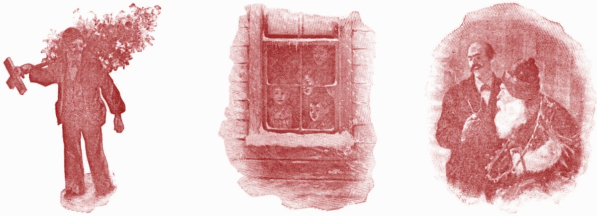 "You youngsters h'ist up-stairs to bed!— Here! kiss yer Ma 'Good-night,' an' me,— We'll he'p old Santy fix the Tree— An' all yer whistles, horns an' drums I'll he'p you toot when morning comes!" It's long while 'fore we go to sleep,— 'Cause down-stairs, all-time somepin' keep A-kindo' scufflin' roun' the floors— An' openin' doors, an' shettin' doors— An' could hear Trip a-whinin', too, Like he don't know ist what to do— |