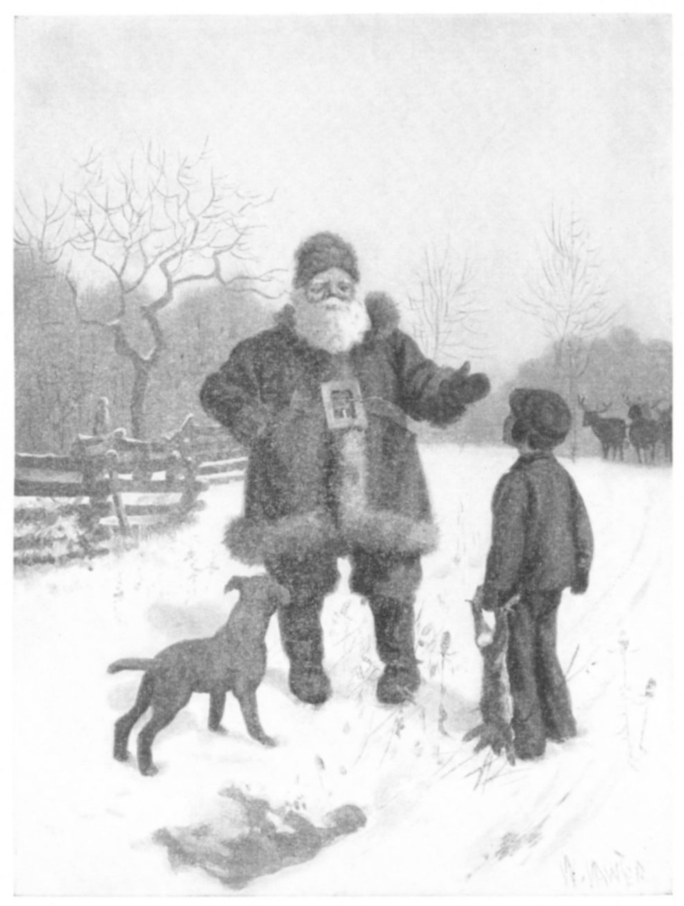 (Ef Trip wuz big, I bet you he 'Uz best watch-dog you ever see!) An' so last winter—ist before It's go' be Chris'mus-Day,—w'y, shore Enough, Pa had to haf to go To 'tend a lawsuit—"An' the snow Ist right fer Santy Claus!" Pa said, As he clumb in old Ayersuz' sled, An' said he's sorry he can't be With us that night—"'Cause," he-says-ee, "Old Santy might be comin' here— This very night of all the year |