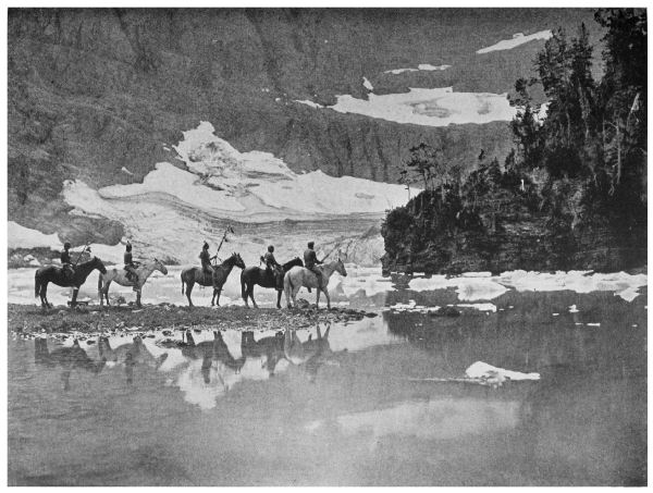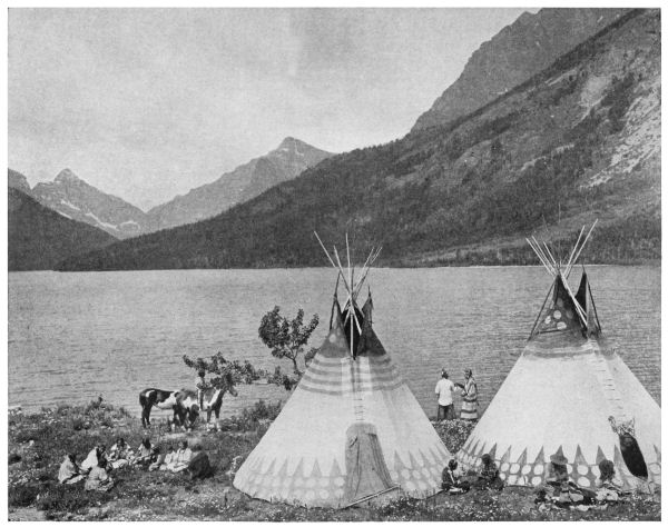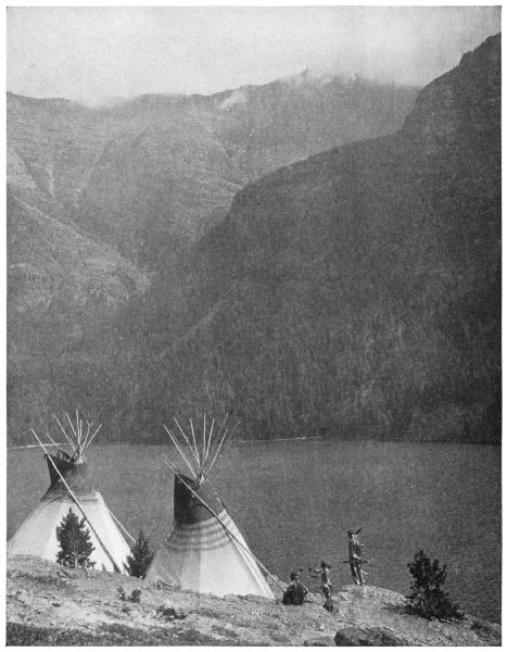 To-day we pitched our lodges under Rising Wolf Mountain, that massive, sky-piercing, snow-crested height of red-and-gray rock which slopes up so steeply from the north shore of Upper Two Medicine Lake. This afternoon we saw upon it, some two or three thousand feet up toward its rugged crest, a few bighorn and a [Pg 2] Rocky Mountain goat. But we may not kill them! Said Tail-Feathers-Coming-over-the-Hill: “There they are! Our meat, but the whites have taken them from us, even as they have taken everything else that is ours!” And so we are eating beef where once we feasted upon the rich ribs and loins of game, which tasted all the better because we trailed and killed it, and with no little labor brought it to the womenfolk in camp.