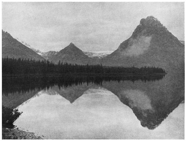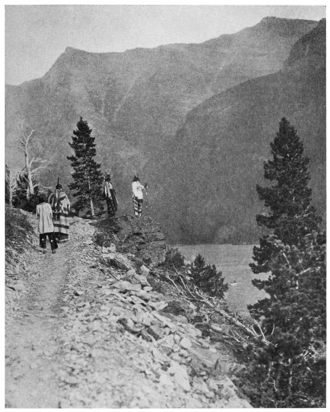 And so, where we once had rude rafts of logs, lashed together with rawhide ropes, we this morning embarked in good boats and went all up the beautiful lake, past Red Eagle, and Little [Pg 212] Chief, and Almost-a-Dog Mountains to the head of the lake, and looking back at the slope of Milk River Ridge saw the far-apart, enormous footprints of Heavy Runner, keeper of the buffalo.