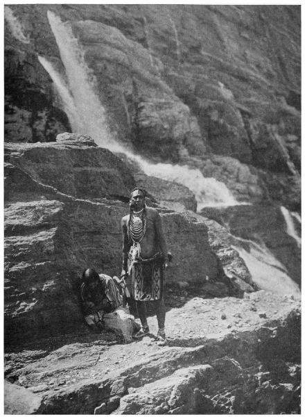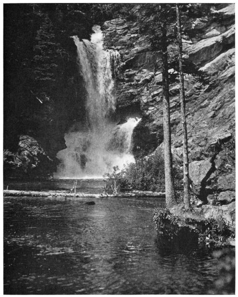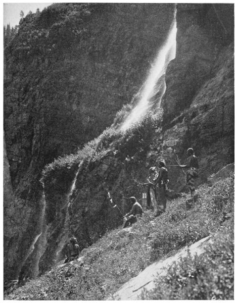 Again my people are filled with resentment against the whites. I told them this afternoon that the falls in the river between this and the lower lake had been given a foolish white men’s name. I could not tell them what it was, for there is no Blackfeet equivalent for the word “Trick.” But what a miserable, circus-suggesting name that is to give to one of the most beautiful of waterfalls, and the only one of its kind in America, and in all the world, for all I know! A short distance below the outlet of the upper lake the river sinks, and a half-mile farther on gushes [Pg 12] into sight from a jagged hole halfway up the side of a high and almost perpendicular cliff.