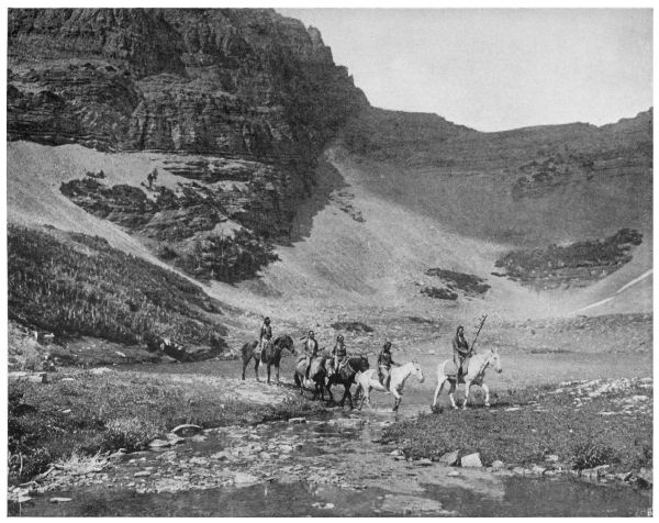 WE came up here the other day to the foot of this great landmark of the country, and made camp beside a running spring in the edge of the timber. The mountain is most appropriately named. It is the outer one of an eastward projecting spur of the range, and is higher than any of the peaks behind it. A chief, a leader, should always be taller, more conspicuous in every way than his followers. This mountain gradually slopes up eastward from the one behind it to an altitude of 9056 feet, then drops in a sheer cliff several thousand feet to its steep slope running down to the plain. From several hundred miles to the north, and an equal distance to the south, and from the Bear Paw Mountains to the east, it can be plainly seen, grim, majestic, a veritable Chief of Mountains, and for that reason the Blackfeet so named it in the long ago.
