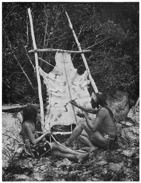 “Perhaps it was the gods that directed his footsteps the next day. As he was going through the timber he came upon the remains of a porcupine, its quills scattered all around upon the ground. He sat down, took up some and examined them, and the thought came to him that they could be dyed different colors and in some way sewed upon garments and make them of [Pg 240] brighter hue. He took all that he could find, and killed several more porcupines, and carried home all the long quills to his woman and told her his plan.