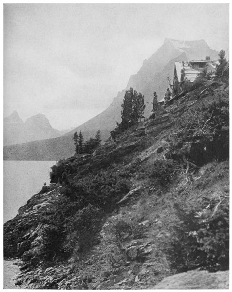 On our way down the lake we passed the beautiful Sun Camp and the chalets of the Great [Pg 214] Northern, perched upon the very spot where Tail-Feathers-Coming-over-the-Hill and I killed many a bighorn and goat in times gone by. It was a favorite wintering place of the animals, for the winds kept the steep mountain slope practically bare from snow. And passing the mouth of the creek just above the camp, I remembered that I had named it after Thomas, and Colonel Robert, and the Honorable Cecil Baring, of London, with whom I often hunted back in the eighties. In those days there were many bighorn and goats, and not a few grizzlies back in the basin at the head of the creek. And what amusing and sometimes exciting adventures we had with them! One morning we espied a big “billy” goat on a ledge, and just as we saw him he moved to the back side of it and lay down, showing only an inch or two of the top of his back.