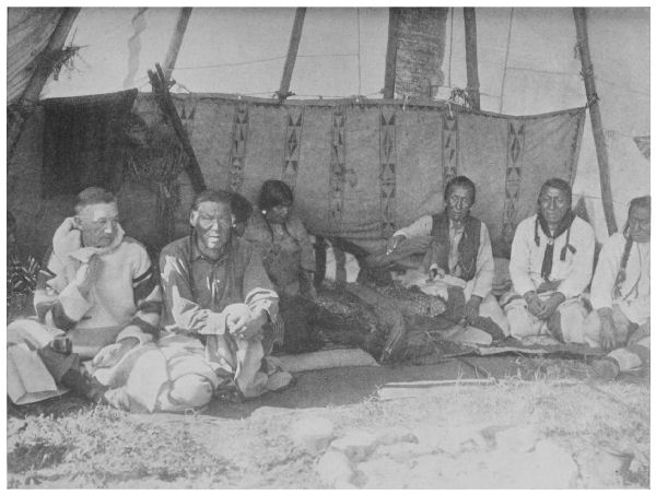 We are a considerable camp of people: Yellow Wolf, my old uncle-in-law; Tail-Feathers-Coming-over-the-Hill, another uncle-in-law; Big Spring; Two Guns; Black Bull; Stabs-by-Mistake; Eagle Child; Eli Guardipe, or Takes-Gun-Ahead. And with them they have their eleven women and fourteen children. All are my especial friends, and all the men have been to war—some of them many times—and have counted coup upon the enemy. Tail-Feathers-Coming-over-the-Hill has many battle scars on different parts of his body. I was with him when he got [Pg 10] the last one, in a fight with the Crees. The bullet struck him in the forehead, ripped open the scalp clear to the back of his head, but did not penetrate the skull. He dropped instantly when struck, and we at first thought that he was dead. It was some hours before he regained consciousness.